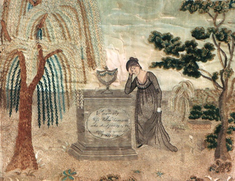 A late 18th Century embroidered mourning scene for a young child worked on an ivory silk ground. The stylized scene includes a central tombstone with the inscription written in ink on silk: ‘In memory of Mifs Betsey Thomson who died Jun 29 1794 aged 4 years’*