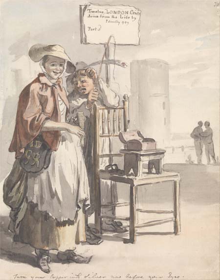Sometimes a vendor sold more than one kind of item, and the well-dressed young lady who cried Will your honour buy a sweet nosegay or a memorandum book may have plied a different trade for her male customers. Street selling could provide a convenient cover and advertisement for prostitution.