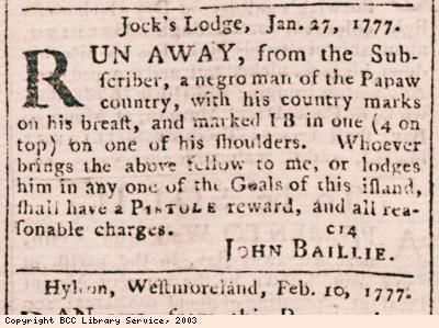 I have to thank a member of the Jamaica Colonial Heritage Society for drawing my attention to a new transcription of advertisements for runaway slaves taken from Jamaican newspapers between 1718 and 1795, and from Workhouse Lists between 1773 and 1795. The list has been edited by Douglas B Chambers of the University of Southern Mississippi and was published in February 2013. There is also a list covering nineteenth century advertisements. The background to the project Documenting Runaway Slaves can be read here.